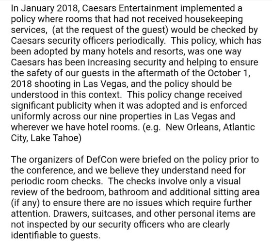 While most of the reports came from attendees staying at Caesars, it’s clear this was much bigger than just one hotel. I got reports over twitter from dozens of Las Vegas hotels. The most interesting thing was just how much variation their was in how this was applied. Some hotels phoned up, used it as an excuse to freshen the room and left chocolate. While others practically kicked the door down and acted like they were executing a warrant. Las Vegas has MUCH work to do if it wants to continue to be seen as a safe destination for hotel guests.